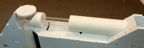 The Leg Strut Lower is actually 2 pieces. one has a similar .63 hole in it's top face. | The other piece is a CNC Cap, made from .125 styrene, with a .065 channel cut into it's surface. It's assembled to a 1.5in acrylic tube. Rotate the Cap so the channel is in the position you want. |