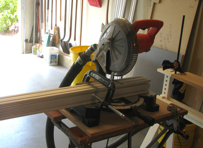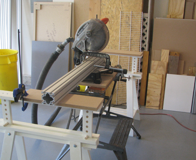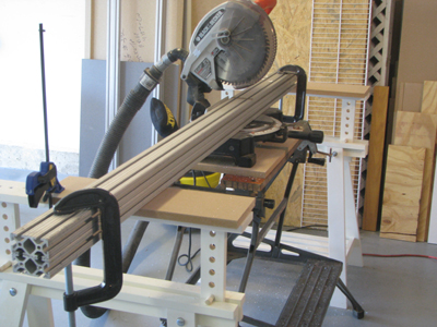 ![]() Cutting the side rails. 2 pieces bolted together and supported on both ends. That's a Black & Decker 10" cutoff (miter) saw. I got it 6 years ago when I finished my basement. I'm using a Black & Decker Piranha 60 tooth carbide blade. I got it when I got the saw and had never used it, so it was relatively new. Any fine tooth carbide balde ought to work just fine. Make sure your saw is cutting square in both directions. Test it on some wood scrap before you ruin expensive 80/20.  |