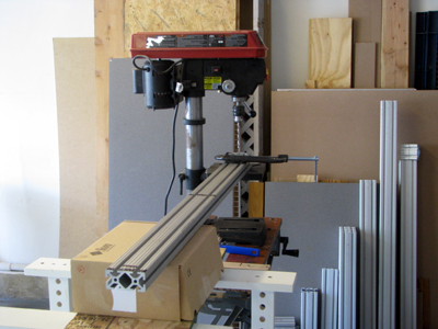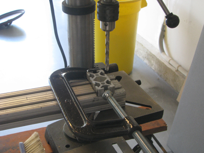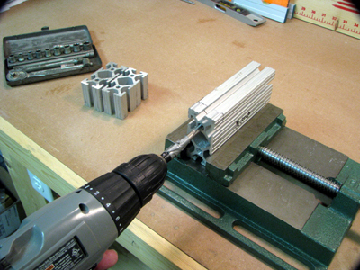 to be supported while being drilled/ To make hole alignment easier, I used one of the 1530 cutoff pieces as both a drill and tap guide by enlarging the center holes.  |