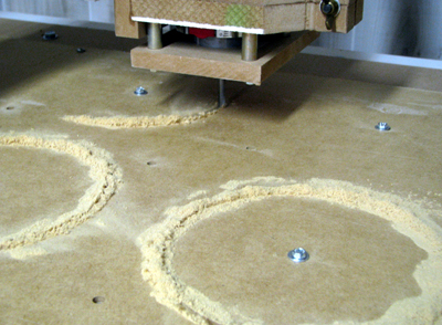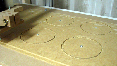 After cutting the circles, remove the center hole screws and the circle pieces. Then put hold down screws in the squares.
