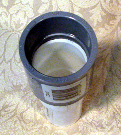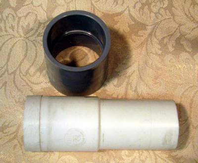 ![]() The threads are ground off until the end of the slip joint just fits inside the end of a standard 1 1/2 inch pipe coupling. Then it's glued in place.  |