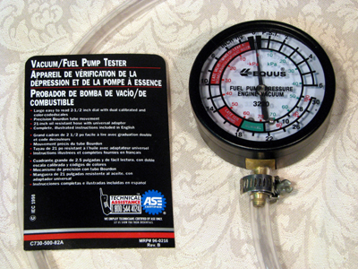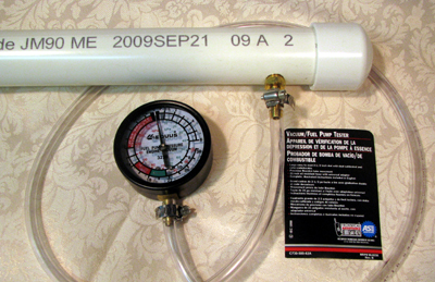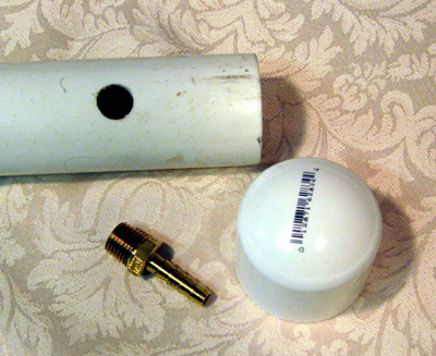 ![]()  | I threaded a barbed hose coupling into a hole in the end of a piece of 1 1/2 inch pvc pipe. The coupling cuts it's own threads. A piece of clear poly tubing and some pipe clamps links the gage to the pipe. A pvc cap terminates the pipe for testing.  |