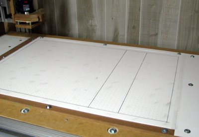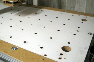 ![]() Cut the mounting holes and vacuum ports into the CNC table. (ouch!) |