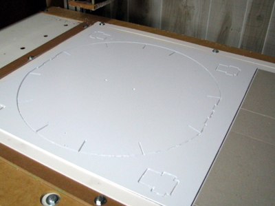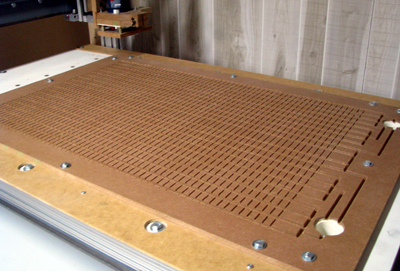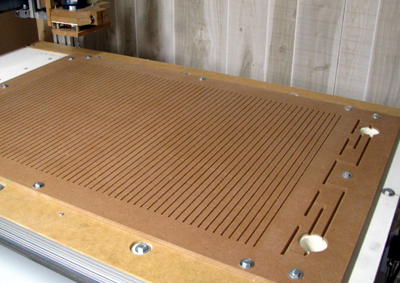 ![]() MDF now bolted onto CNC table and vacuum ports cut. See my notes below on do-overs. Those slots are too small. |