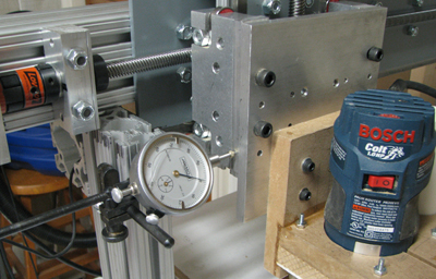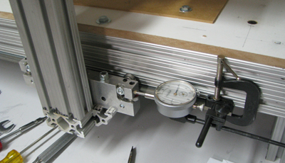 ![]() This is my setup for the Y axis. One drawback to this setup is that the indicator has to be moved out of position whenever you home the y-axis. To the left is the setup used to test the z-axis  |