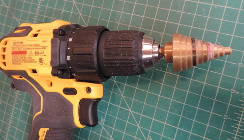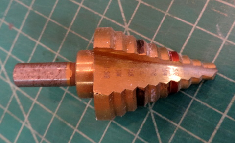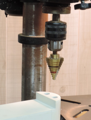 This is a Step Drill. It goes from 1/8in to 1 3/8in. They are available from most of the usual Hardware stores. I bought mine on eBay. Note the Magic Marker I used to highlight how deep I needed to go. [It's easy to get carried away :-( ] | If your parts are assembled you can use a Hand Drill to enlarge the holes. Make sure you hold the drill perpendicular to the part or you can easily cut an oval hole. |