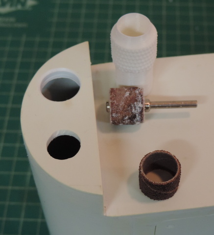 If at all possible use a drill press. You can also drill out the holes in the outer foot shell (use a hand drill, drill from both inside and outside of the shell) | The styrene sheet is 1/8 in thick and the steps on the drill are also 1/8 in (It's designed to enlarge holes in sheet metal). As a result there will be a burr (edge) on the bottom of the hole. Use a sanding drum (Dremel shown) or a circular file to remove it. |