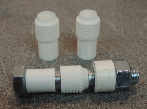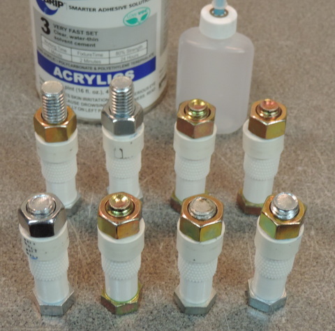 Above: I use a 1/2in bolt to hold the parts together while they are being glued. the oversize white spacer at the nut end keeps the nut from crushing the top edge of the fitting. Right: I bought enough bolts to assemble a full set of 8 fittings at one time. A single drop of #3 solvent flows around the joint and is enough to glue the fitting. | |