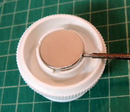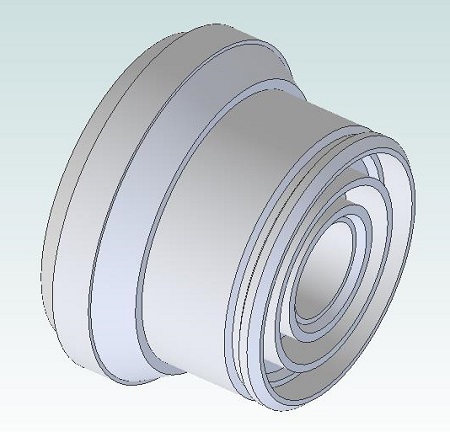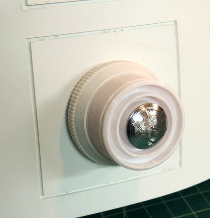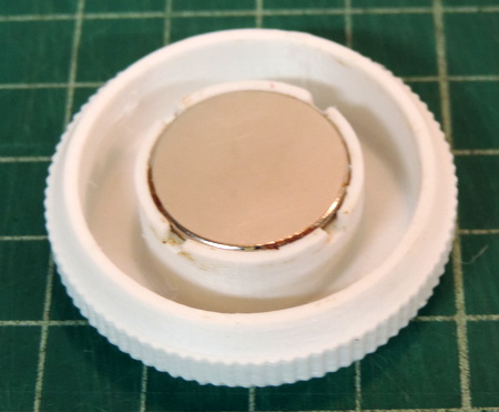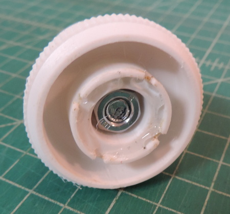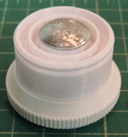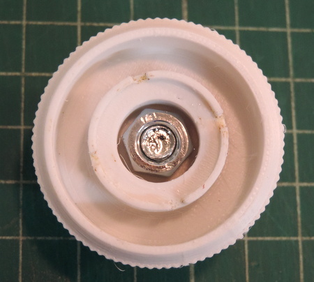 on the part! Using that model as a starting point, I added the missing knurl, and then made some additional changes. To make it 3D printable I segmented the full model (below) into a front half (green) and a rear half (red). I also included an M8 Carriage Bolt and mating Nut to the model. After a discussion with Michael Paul, K&J Magnetics, Inc. about the various options for holding the Arri Bolt to a styrene Droid with a .08 thick skin. I decided to use his suggestion of a DF03 magnet in the recess at the rear of the bolt and a stronger DF2 magnet behind the skin area where the Bolt is going to be attached. In order to be able to remove the magnet from the restraining bolt (even after it's glued in!) I added 4 slots to the recess which was enlarged slightly to fit the DF03 magnet. |