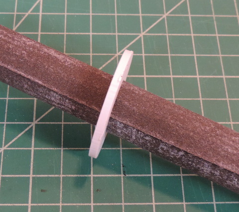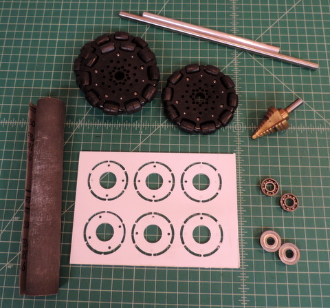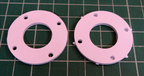 wheels, Version 2 will have twice as many parts.) Above: remove the parts from the panel & trim off the tabs. Not shown in this version, one spacer of each set of 3 will have countersunk holes, another one will have a recess for the hex nut. The third one is used as a spacer between the two wheels. | |