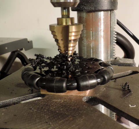 Above: I put a block of wood under the wheel because the Step Drill extends through the wheel body. (yes, I've drilled into the table of my drill press. avoid that if you can - it dulls the drill bits!) Right: The swarf will obscure your progress - Turn off the Drill, wait for it to stop spinning, and clean it off! Then continue... | |