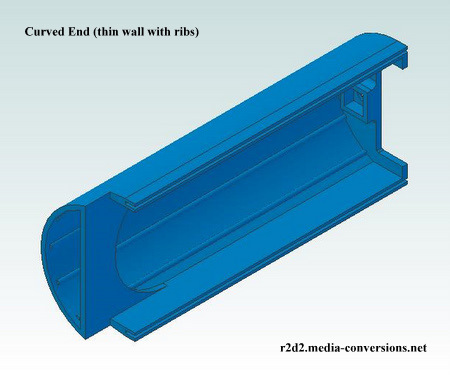 I thought I was done designing curved ends when the one I was working with slipped out of my hands and hit the concrete floor of my workshop. To my surprise it had split along the print layers. Something that I had not experienced with other parts I've printed. This one, however, at over 7 inches in height, is the tallest part that I've printed so far. There were a few changes made so that the parts were more durable. First, I enclosed the printer to raise the ambient the parts are printed in from ~20 deg. C to ~25 deg. C. Second I increased the temperature of the extruder from 230 deg. C to 234 deg. C. This helps the layers stick together better. Finally, although it's counter intuitive, I reduced the wall thickness of the part from .125 in to .1 in while at the same time increasing the internal fill ratio from 20% to 80%. Basically it means the parts are almost solid. Internal ribs were also added to strengthen the parts. They can now survive 3 drops without any damage! |