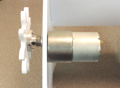 The spur drive gear was temporarily spaced up on the motor shaft using washers as a way to get the spacing correct for it to mate with the internal gear mounted to the Rockler. |
