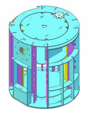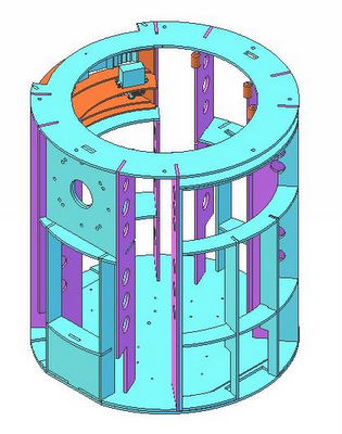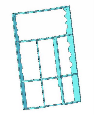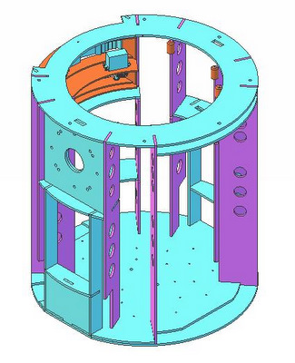 removable Rear Door Frame and removable Core Insert. Features: Frame bottom is a pair of ring panels, ribs only penetrate the top panel (ring1) leaving the bottom panel (ring 0 - the base of the skirt) without holes that need to be filled. Ring 1 has cutouts to accommodate parts that need to be mounted on the bottom edge of the skin (Power Couplings & Octagon Ports) Eight full height ribs (in purple) support the removable core. Four of those have to be trimmed at the bottom to provide clearance for parts mounted on the skin. |