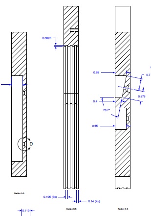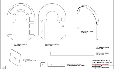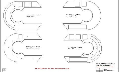 prototype has been put into production. For assembly instructions go to the assembly pages To the Left is an exploded view of the assembly. That image links to a larger version where it's easier to see the details. The assembly instructions have more detailed drawings. There are 4 layers of .188 with a layer of .125 in between the two sets of .188 and a final layer of .125 for the shim. I've taken the liberty of carving out sections of the inner layers to reduce the weight of the finished parts. There are a few .040 parts to bring the cavities to the correct depth as well as a 3D printed wedge. I've added keyhole slots to the shim for mounting. If you don't want to use a shim you can use it as a template to cut keyhole slots in your legs. |