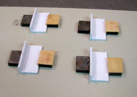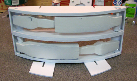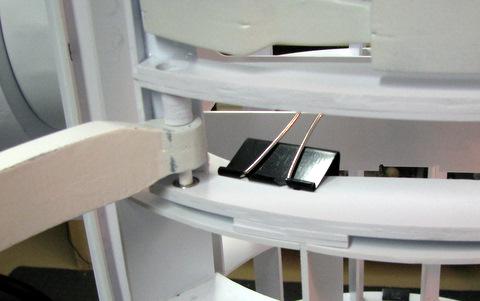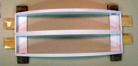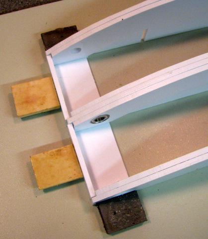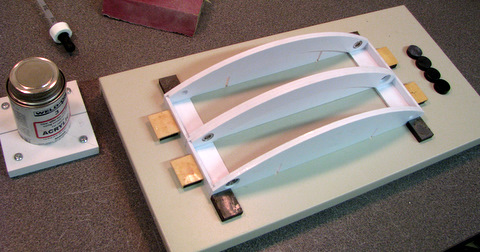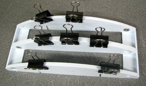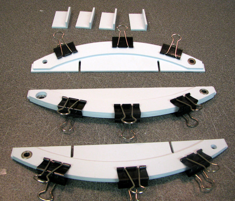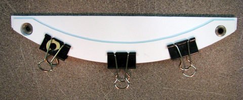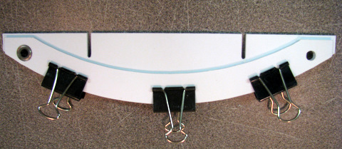 in these pictures to maintain the parts alignment. The corner pieces from the previous step are used to verify the edge positions while clamping. Again, apply Weldon #3 along the inside edge of the curve in sufficient amount to hold the parts together. |