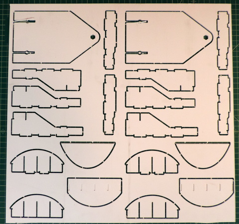 First step is to separate all of the parts from the sheets they were machined from, remove the tabs and flash, if any.| The parts are on 3 panels.Below the .188 and .040 panels Right: the .125 panel. | |