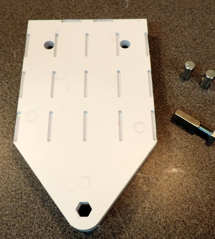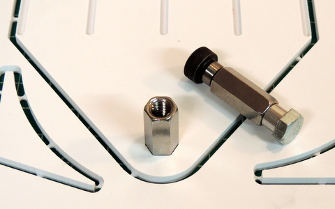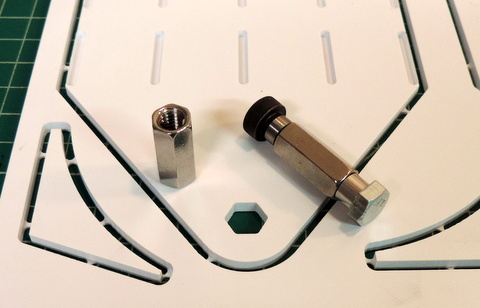 | Hex coupling nut shown with shoulder bolt and hex nut/spacer. | The corners of the hex hole are slightly rounded. You'll need to sharpen them up a little for the coupling nut to fit easily. Do that before gluing so the nut can be used for alignment. |