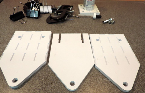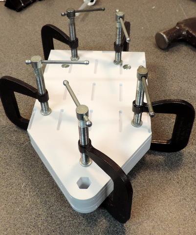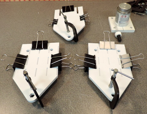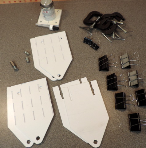 | Left: gather the structural panels together with a lot of clamps. Assemble pairs of panels for gluing. Use the dowel pins and the shoulder bolt for alignment. Drip Weldon #3 through the slots in the .188 panels and through the holes in the .125 panel. | |