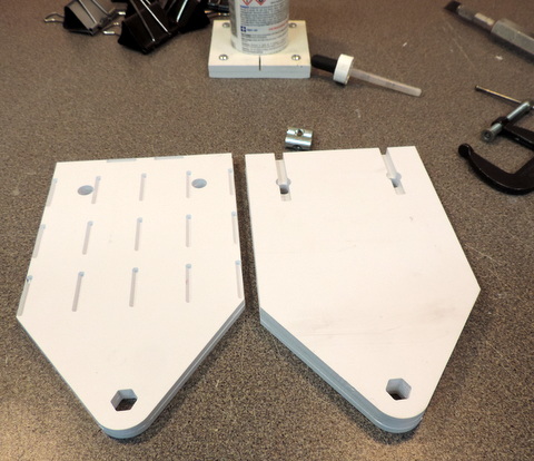 | Above: Clamp the stack of 3 panels. Again, use the dowel pins and the coupling nut for alignment. There are glue holes in the outer panels for you to drip #3 Weldon into to get a better joint between the outer .188 assemblies and the inner .125 assembly Left: the finished structural assembly. Next steps will be adding the eggcrate parts to finish the center ankle. | |