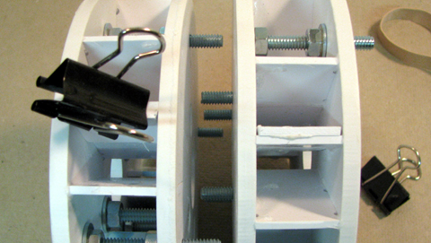 | At this point you are ready to glue up the shoulders. My suggestion is to do one side at a time as follows: Remove the nuts, but leave the bolts in place. lift off the plate that's on top (doesn't matter if it's inner or outer). One at a time, remove a riser, coat the mating edges of the riser with glue and re-insert in it's slot. make sure the riser is as far to the outside of the plate as it will go. the outside edge supports the .040 wrap that goes on later. It's wok if it sticks out a hair, you can always file it down after the glue drys. Replace the plate you removed earlier and bolt together. Set aside till the glue drys. Again remove the nuts, but leave the bolts in place. Take off the plate to be glued. Carefully run a bead of glue on the surface of the all of risers that contact the plate.Work quickly as the glue will run. Replace the plate, and bolt together. Turn the assembly over so that the plate being glued is down. You can reach in and add glue to the area where the riser and slot meet.. Set aside till the glue drys. | |