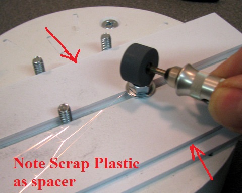There are lots of tools you can use to trim the nuts. I choose a dermel grinding tool. | Above: Before and after trimming. Watch out for a thin edge at the top of the bolt. It can be sharp! Left: Expect the Nut to be ground down a little. Use the same Nut, moving it from bolt to bolt. Throw it away when you are done. Whatever process you use, it will generate heat! Keep the bolt/nut cool by using a wet cloth. If it get's too hot your styrene can melt! |