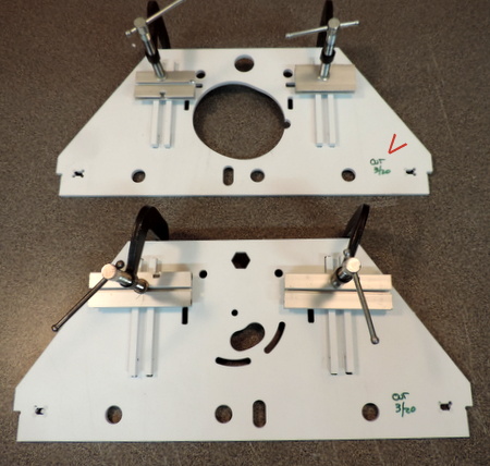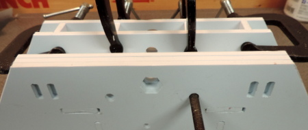 slot to hold alignment while I was tightening the clamps. Right: with the clamp tight, put something dark behind the 2 pieces so you can check the alignment. Glue when you've got it correct. | |