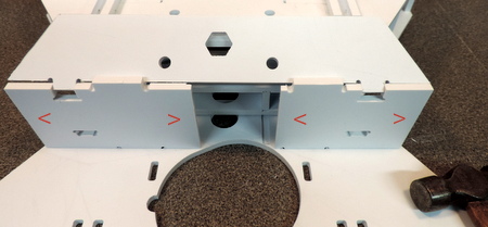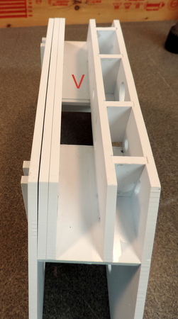 There is a critical alignment issue that will come up in the assembly after the cross pieces are glued. There are 3 filler pieces with tabs that fit into slots in the cross pieces. The tabs are smaller than the slots. But the cross pieces can be shifted in the side panels (the slots are oversize). If that happens the tabs won't align with the slots!!! Note the edges of the cross pieces noted by the red V's - they should be lined up with the edges of the side panels! |