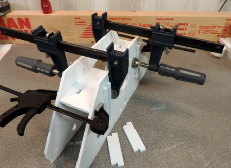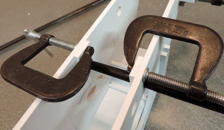 Above: start with 2 heavy duty clamps to make sure the side panels are in close contact to the cross members. Then add clamps at the edges. Right: you can clamp the two smaller front & rear pieces as well |