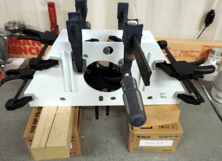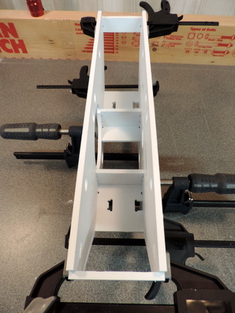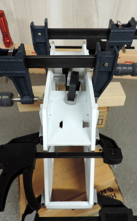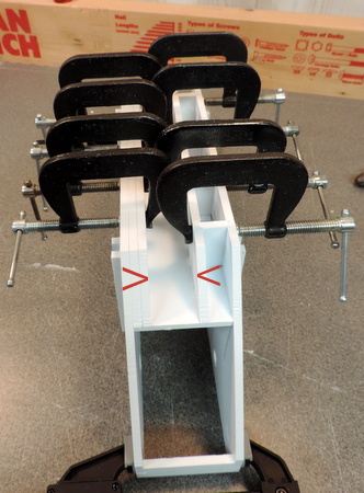 | Left: add the 4 attachment points for the bolts that will hold the shell to the drive. If necessary add a long bar clamp so that the 2 end supports make a tight glue joint to the end panels. [my earlier attempts sometimes only got a tight joint on one side!] | |