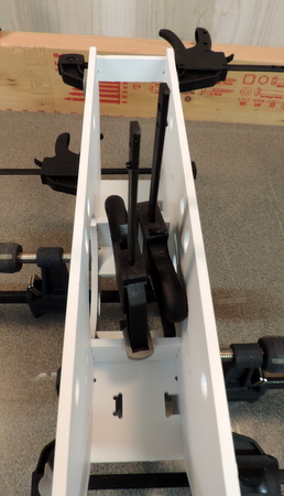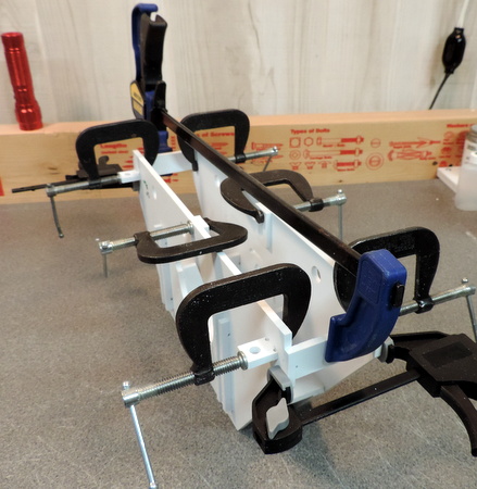 | Left: it starts to get a bit crowded, when you add clamps to hold the smaller cross pieces against the larger upper ones. Above: with 20/20 hindsight - if you are using bar clamps (like I am) you'll need something to provide clearance for the clamps so you can put the assembly down while the glue dries! PLAN AHEad :-) |