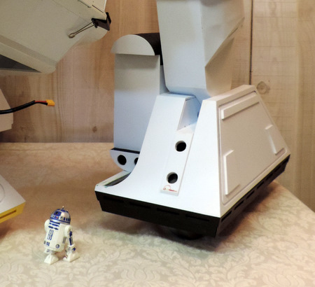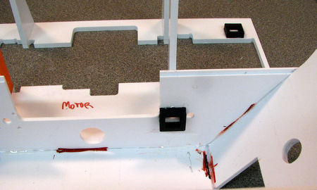 | There is a lot of symmetry in the design. The motor extends into the inside of the Battery Box (on the inside of the droid). The vertical inside brace with the nut trap goes to the rear of the foot so make sure it matches the shell you are working on. | |