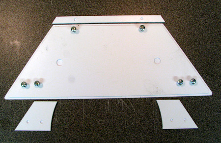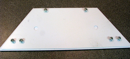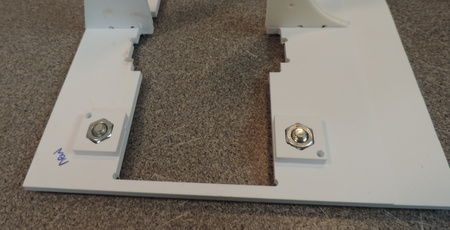 | Left: there are 4 Nut Traps to be installed onto the bottom plate we have eliminated the 3D printed nut traps with the legs that fit into mating holes in the frame. (Some of the holes are still there). Put a bolt/nut into the hole in the bottom plate. Drop a CNC cut nut trap om top. Align the edge of the nut trap with the edge of the cutout in the bottom plate. Put a drop of Weldon #3 on top of the nut - as with the braces let it sit undisturbed until the joint has set. |