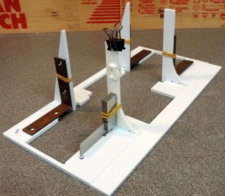 clamp the vertical braces in line with the marks. Glue from the inside using Weldon #3. Be very careful to not get the Weldon on the outside surface! |