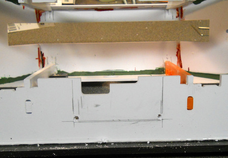 build up a smooth flat surface for the apron to attach to. Use a little at a time (Left is too much) and smooth it flat while it's still wet. Don't go back once the putty is set as you wind up with a rough surface that you have to file/sand. |