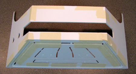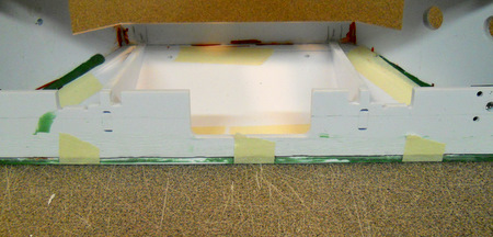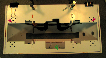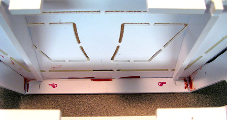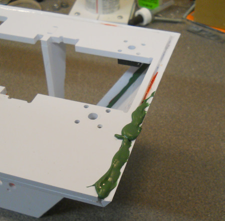 gluing both to the brace bottom plate. Turn things over and run a bead of Weldon #16 into the joints of the shell marked by the RED fingers. Don't put glue into the joint marked by the GREEN finger (see below for why!) |