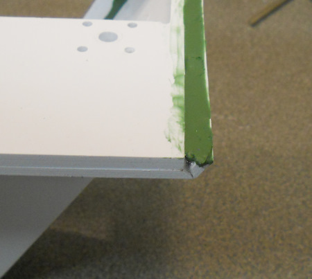 once your joint is dry, remove it from the corner clamp. then run a bead of Weldon #16 down the inside of the joint. don't get any on the top or bottom of the apron. |