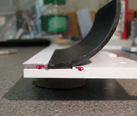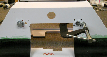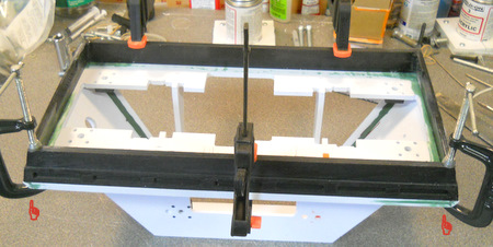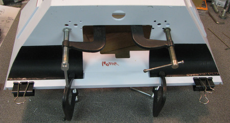 With the outside edge of the frame clamped, put the bottom plate filler in place (it's held by the spring clips) clamp the shell to the vertical braces and clamp the inside edges of the curved pieces to the brace. |