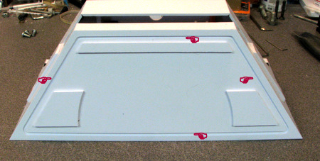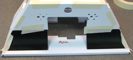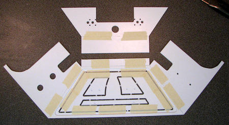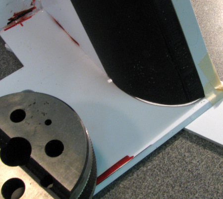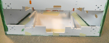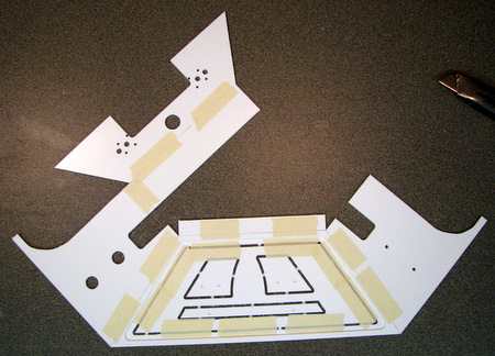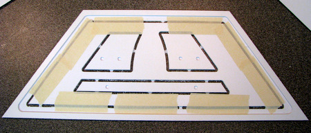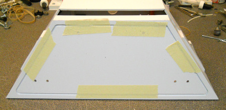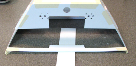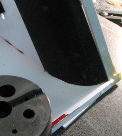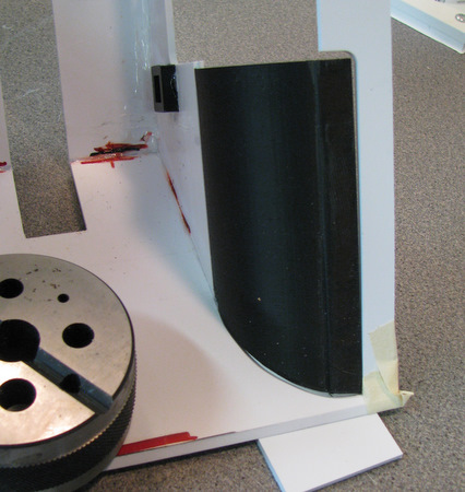 edges on the curved piece with a file. Above: tape the bottom filler strip to the ends of the two shell end plates. It will 'droop' a little, put a piece of scrap under it to keep it flat while you are taping it. |