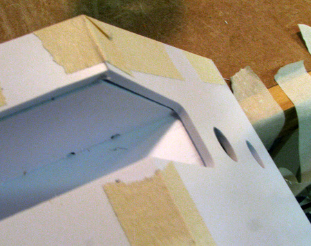 Rather than clamp it, which might distort the edge, tape the side panel into the frame inside (above) and out (Below - left) |