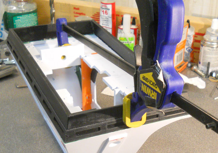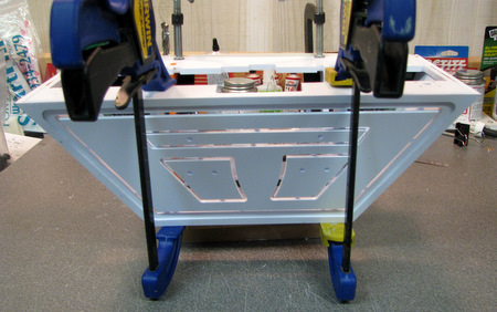 | First step is to line up the apron so that the slots in the short sides match the center channel where the drive slides into the shell. More than likely your apron will be slightly smaller than the edge of the shell. You want to position it so equal amounts of edge show on all sides. This is easier said than done. Once you have a feel for how much space that should be, start on the inside edge since that's the easiest location for clamps. Clamp the ends first, setting up equal amounts of edge as shown below. Then use the clamp in the center to match the spacing in the middle. Start by dripping Weldon #3 into the joint along the edge (not in the corners for now) | |