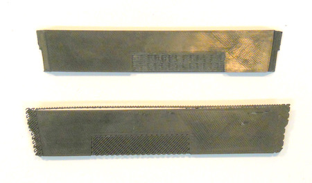 assembly. Right: the two shorter apron parts have been printed using "support". Support was needed to hold up the surface where the notch is. |