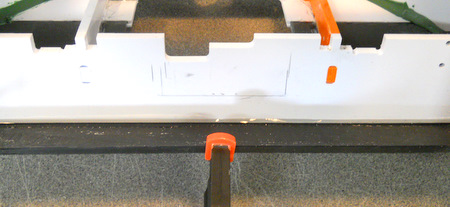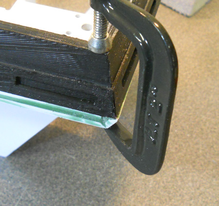 While the C-Clamps hold the pieces against the bottom of the corner fixture, adjust the clamps of the corner fixture so that the edge shown above is flat against the bottom of the fixture. Drip just a drop or two of Weldon #3 into the joint and let it dry. |