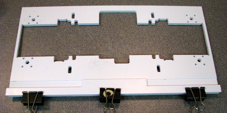 With the outside edge of the frame clamped, put the bottom plate filler in place (it's held by the spring clips) clamp the shell to the vertical braces and clamp the inside edges of the curved pieces to the brace. |