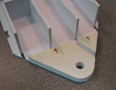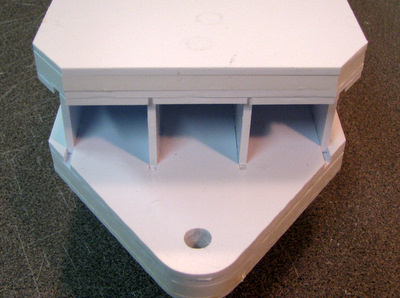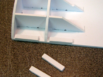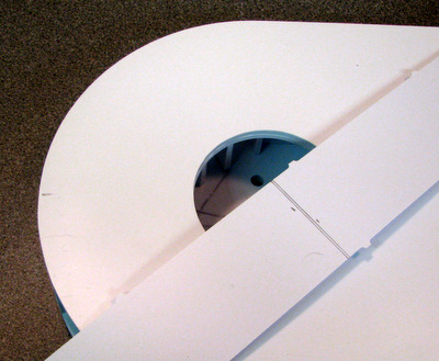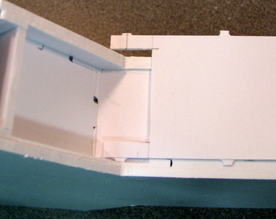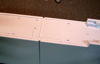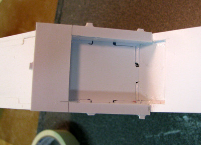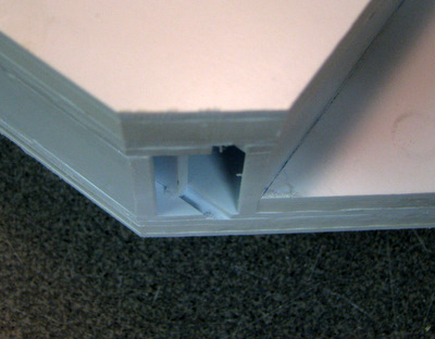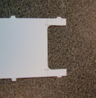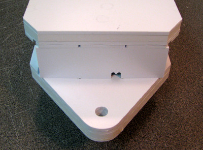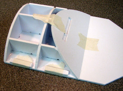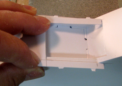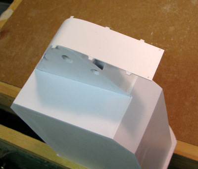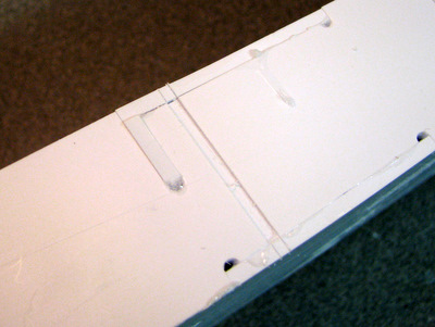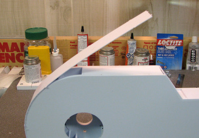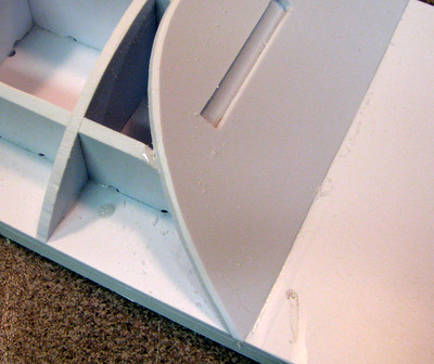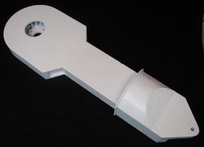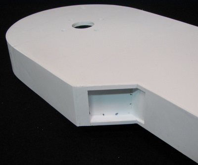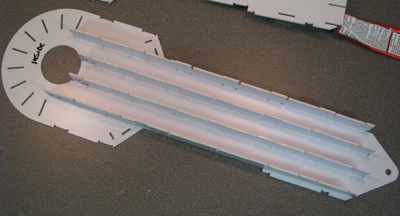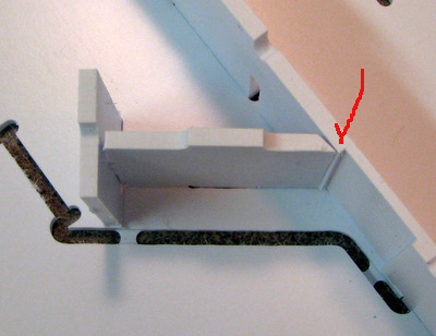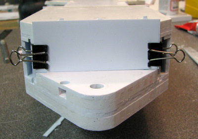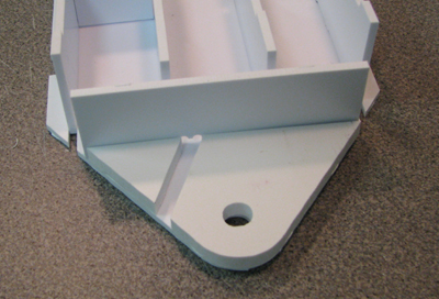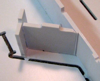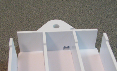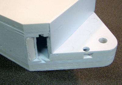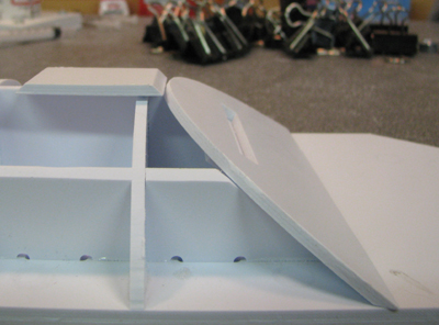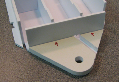 ![]() Glue the cover piece using the rectangle alignment marks. It fits in the notch on the center rib so alignment is critical! Note the taper on the edge of the part above. Make sure you are gluing on the INSIDE as shown. |