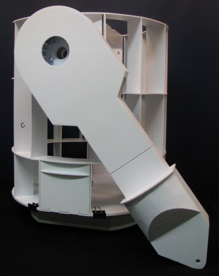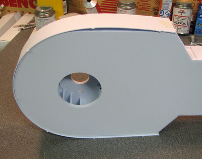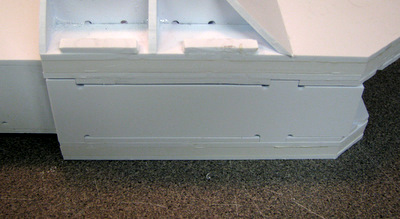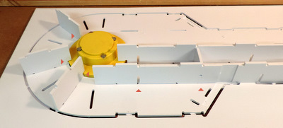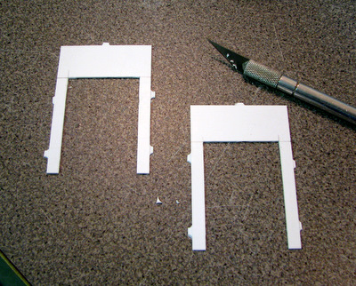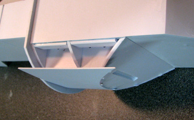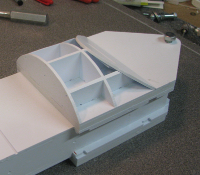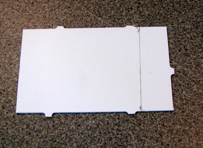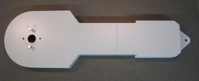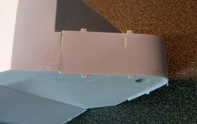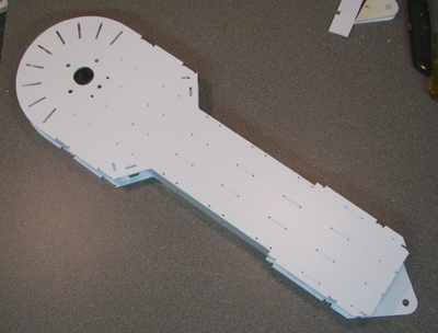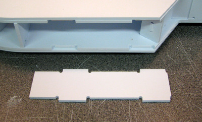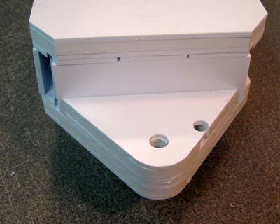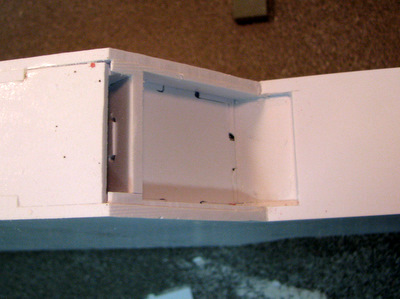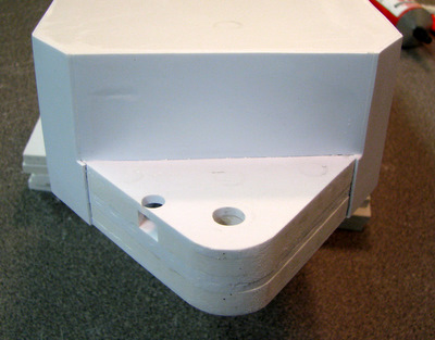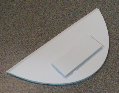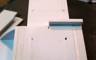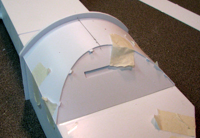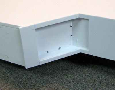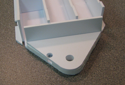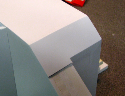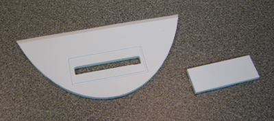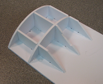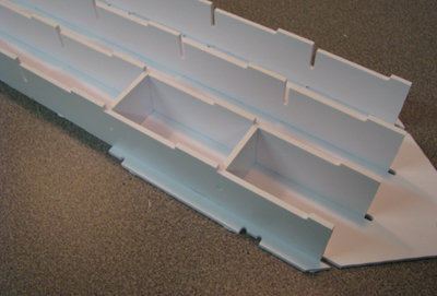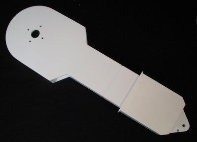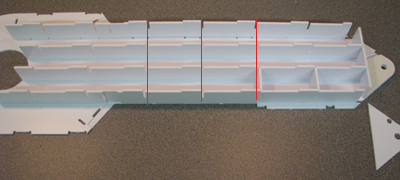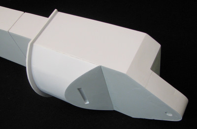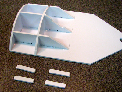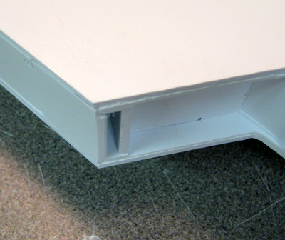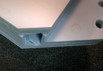 ![]() Glue the cover piece using the rectangle alignment marks. It fits in the notch on the center rib so alignment is critical! Note the taper on the edge of the part above. Make sure you are gluing on the INSIDE as shown. |