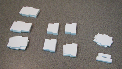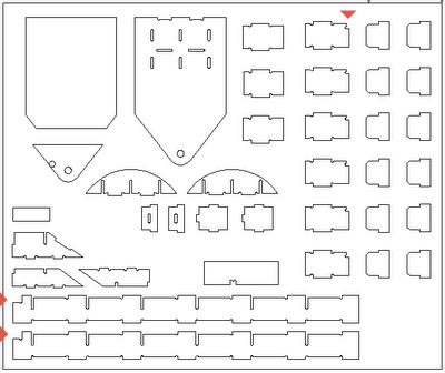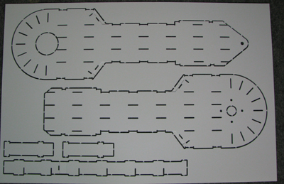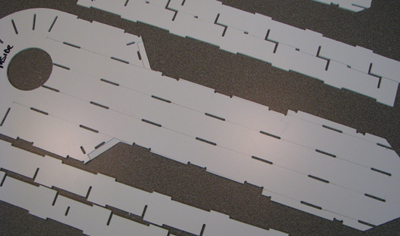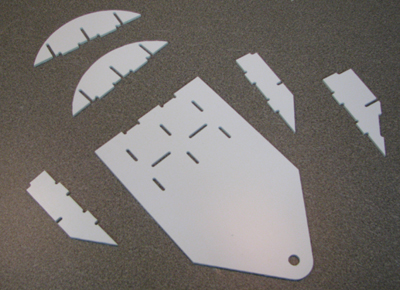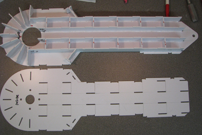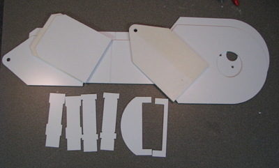 ![]() Above: Leg bottom inside, outside and inner .25 thick components This is now a set of two .125 panels that you will have to glue together. Left: Leg Risers and Ankle Curve components With the change in shoulder hub mounting, the parts marked now have notches for clearance. Pay attention to the orientation of the notches |