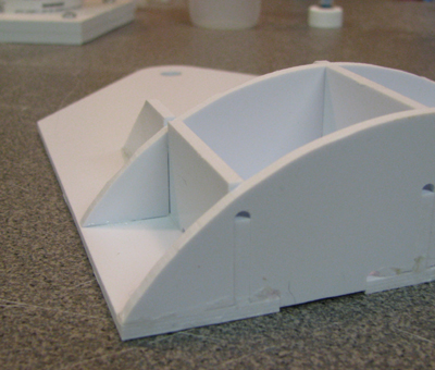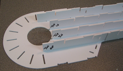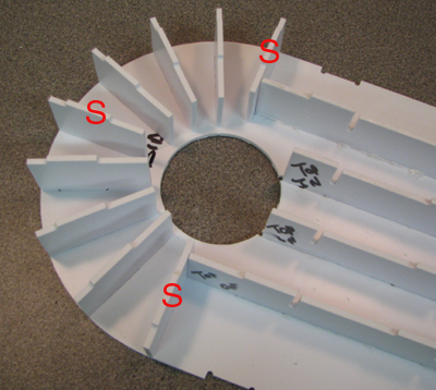 Ankle Curve: The two outside ribs, and the skin blocks, are cut oversize so that they can be shaped to fit the contour of the ring. |