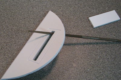 Above: File the top and bottom edges being careful not to cut into the leg surface. Right: If necessary, trim the part of the skin at the slot end. |
