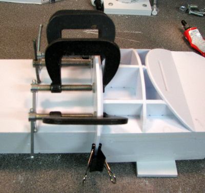 places. Note that it now includes the tops of the cross braces. Apply glue. Mate the two parts and clamp everywhere. |